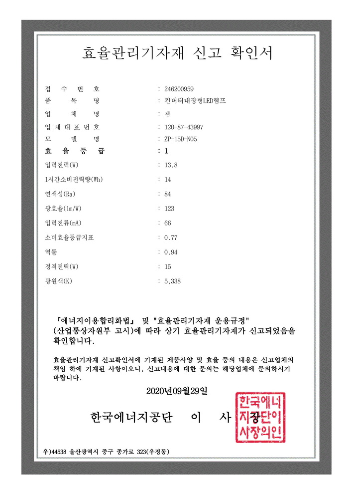 | 광효율 | 105 lm/W 이상 | 90 lm/W 이상 | 105 lm/W 이상 | 105 lm/W 이상 |