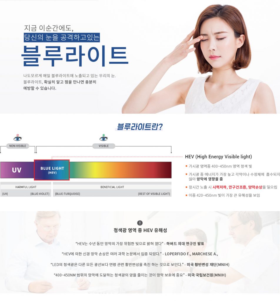 유해한 파장으로는 블루라이트로 잘 알려진 400~450nm 영역에 속하는 빛인 HEV(High Energy Visible light)로 가시광 중 에너지가 가장 높고, 각막과 수정체에서 흡수하지 못해 망막에 영향을 주는 파장이다. HEV에 장시간 노출되면 시력저하나 안구건조증, 망막손상 등을 유발해 눈 건강에 위협을 줄 수 있다.