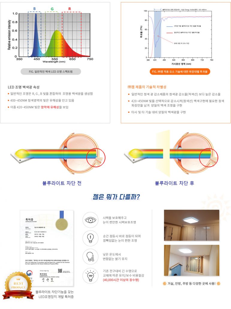 따라서 눈을 보호하기 위해서는 망막에 도달하는 블루라이트의 양을 줄여야 한다. 이에 젬엘이디는 기존 블루라이트 저감 제품보다 청색광 감소율을 높인 제품을 개발하였으며,